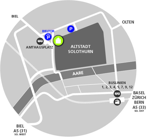 Oder gehe ab dem Hauptbahnhof zu Fuss via Kreuzackerbrücke über die Aare, dann quer durch die Altstadt Solothurn (siehe Lageplan links).